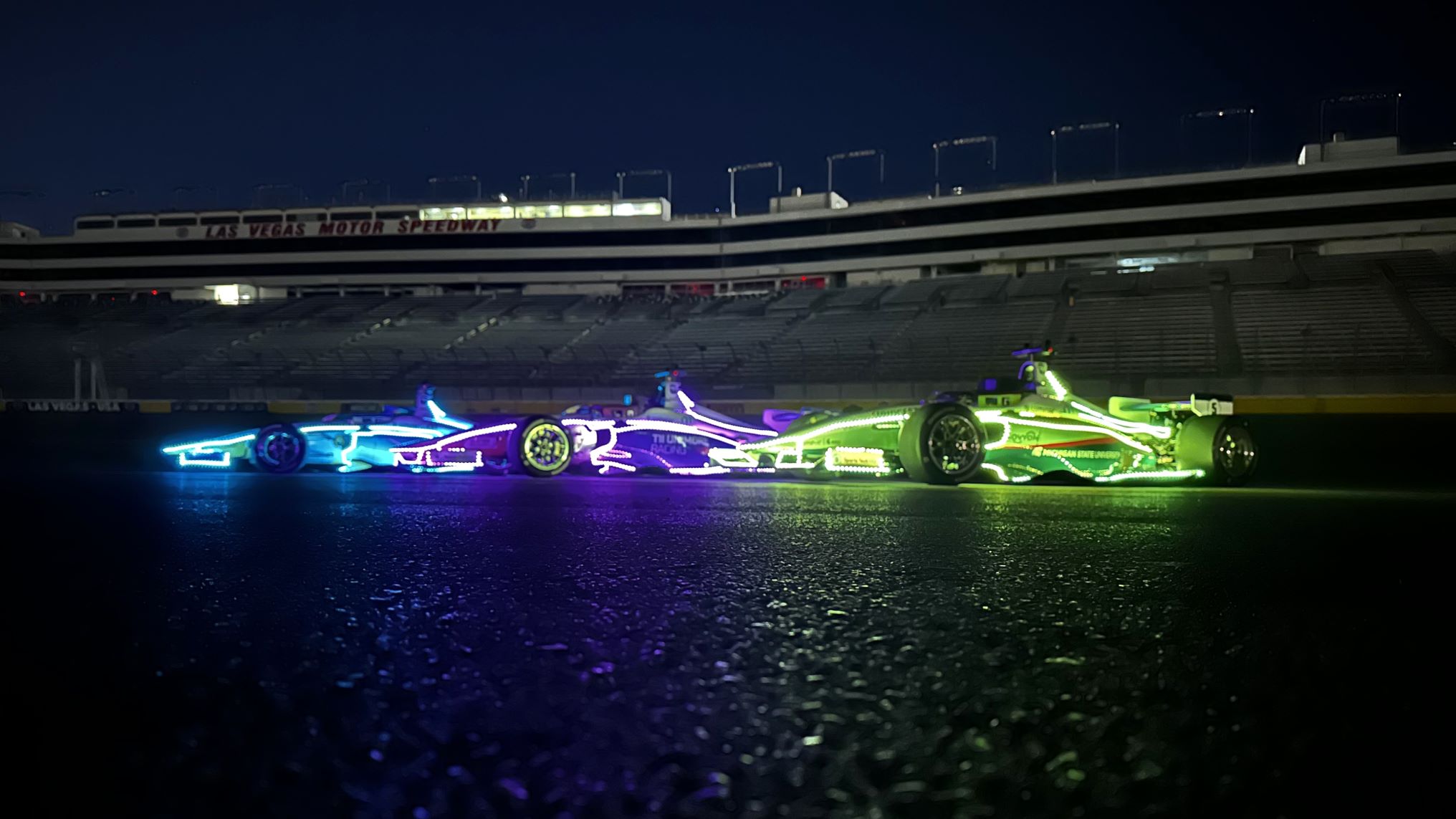 Three teams from nine universities demonstrated the AV-24 racecar at Las Vegas Motor Speedway, including AI Racing Tech from the UC Berkeley; University of Hawai’i; UC San Diego; and Carnegie Mellon University; PoliMOVE-MSU; and TII UNIMORE Racing from the University of Modena and Reggio Emilia.