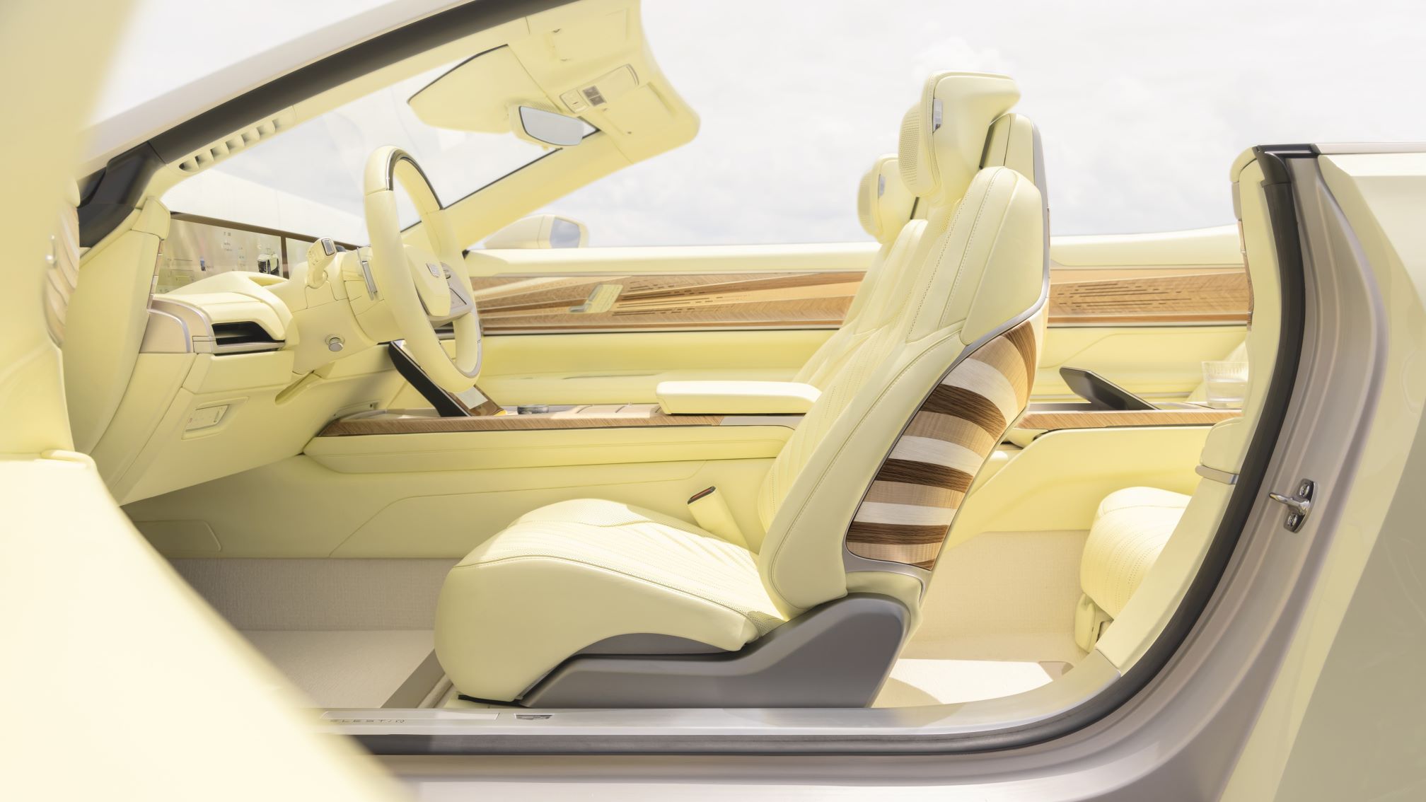 The car’s name is derived from sun (Sol) and leisure (lei), with a launch-event display telling the story of the concept’s inspiration for an open air, leisurely lifestyle, complete with bespoke accessories of a glassware set, 3D printed bird calls, hand-printed silk scarves, and an illustrated journal. Highlights of the all-electric, 2+2 convertible are exterior lighting choreography for arrival and departure and an interior equipped with the brand’s 55-in pillar-to-pillar screen and front and rear command consoles.