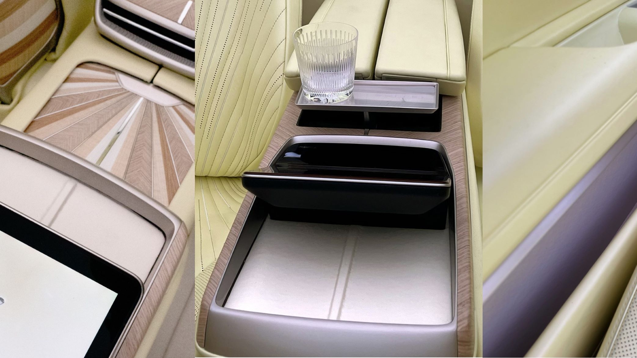 The Fine Nappa leather features a pink iridescent pigment that creates a color-changing sunrise effect. A pink iridescent hue on the beverage chiller door and glass tray in the rear compartment reveals different sunlight exposures. An Aurora tint on primary metal finishes includes color shifting to reflect the phenomenon of the sun’s solar winds reacting with the earth’s atmosphere.