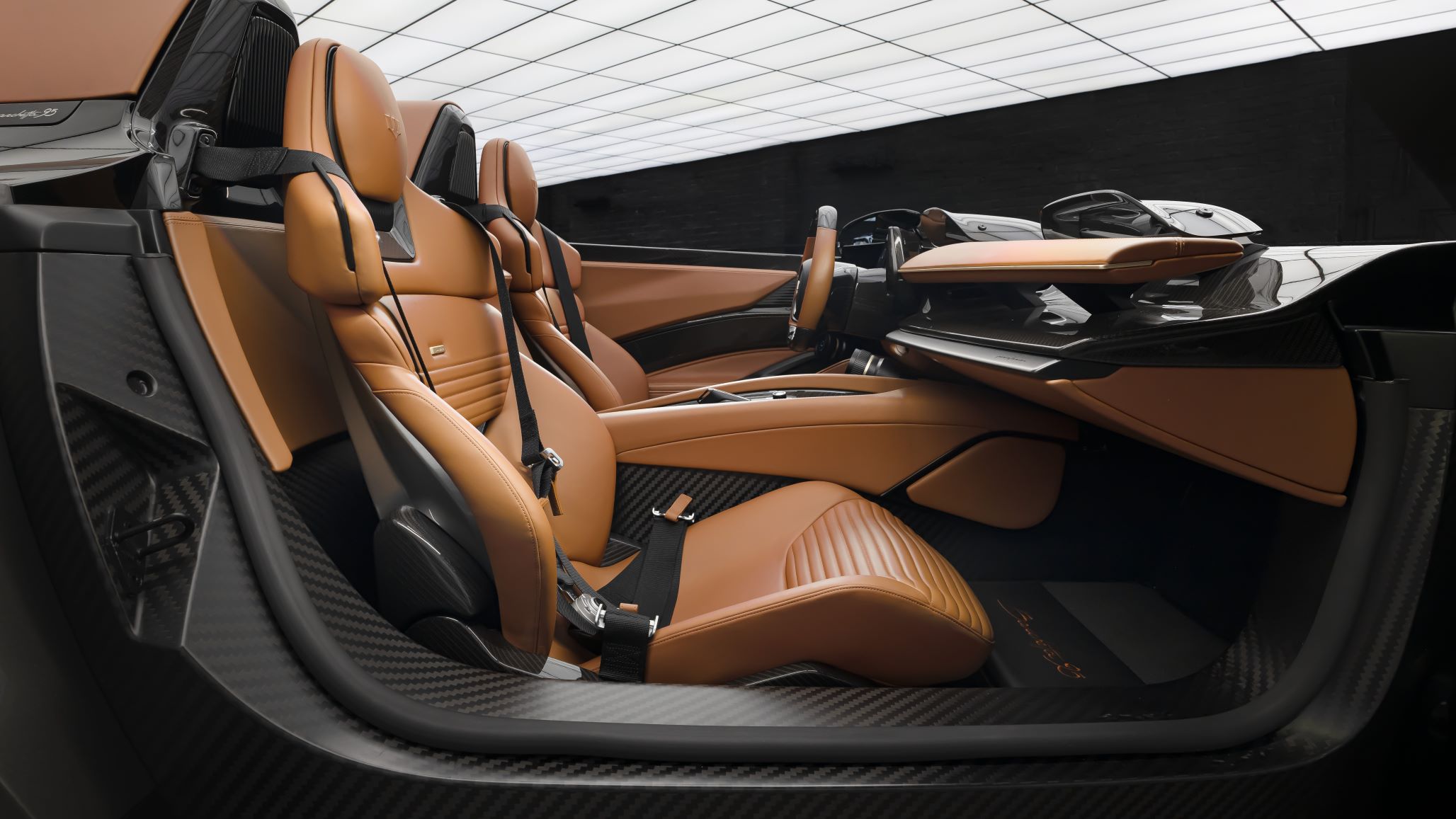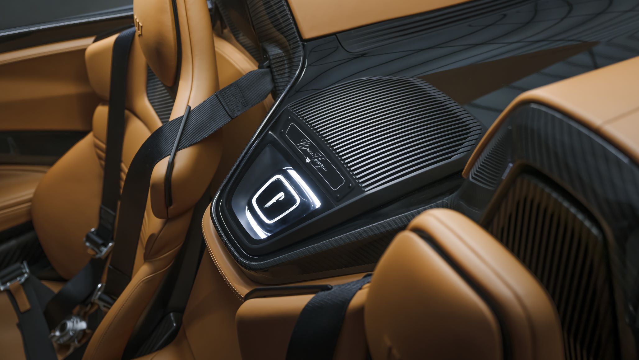 Like all versions of the B95 Barchetta, the Gotham’s exterior incorporates two electronically adjustable aero screens to deflect air over the open cabin. Wayne Enterprises logos are on the body, chassis plate, and door plates. Unique wheels feature a matt black inner and gloss black outer ring, with Titan calipers and a brushed aluminum anodized black center lock ring.