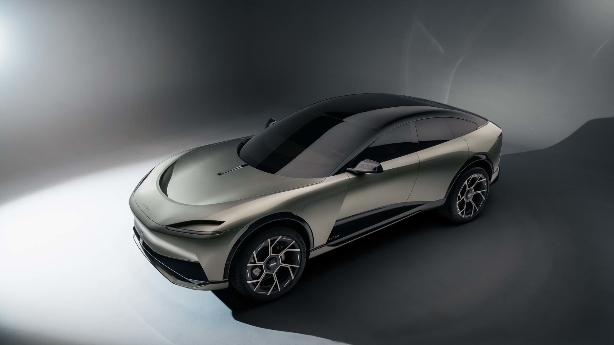 The Comet Line here spans the entire width of the Ivara to accentuate the steeply raked windshield, tracking around the cabin, and then continuing through the widest point of the rear fenders. A secondary Comet Line separates the all-black upper cabin section with a full panoramic roof from the lower body.
