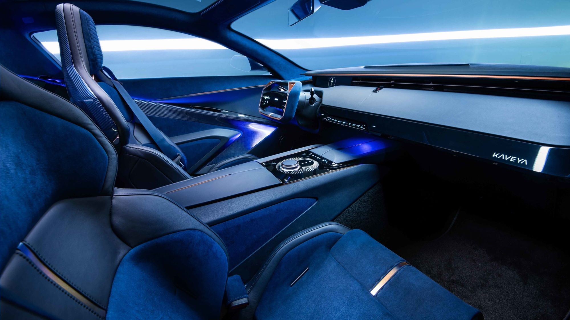 The midnight blue leather produced in partnership with Bridge of Weir is meant to conjure the vastness of outer space, completing a narrative from the Kaveya’s exterior Comet Line and Interstellar Silver paintwork through to its interior.