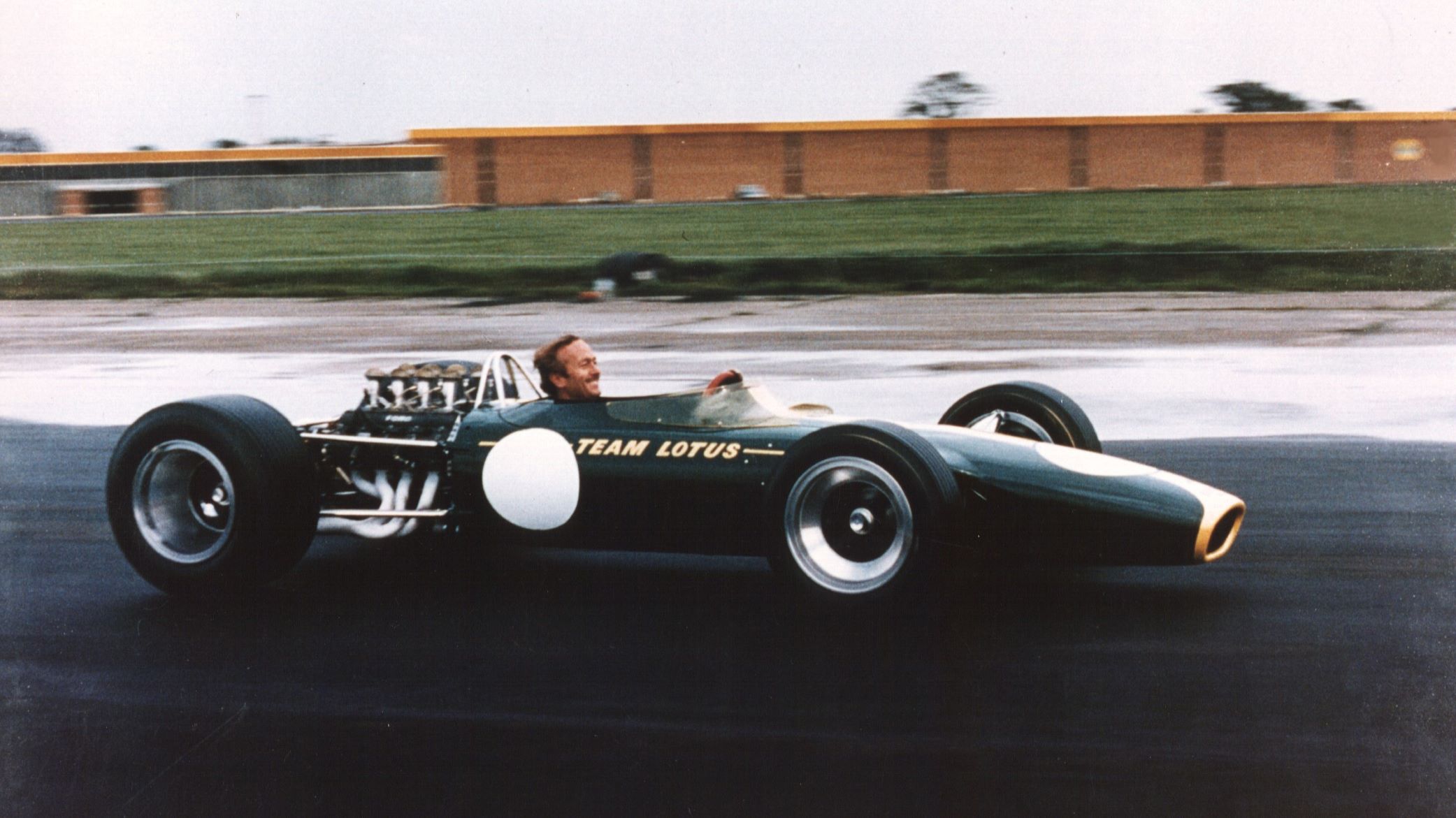 - Lotus founder Colin Chapman in a Lotus 49 at Hethel HQ.