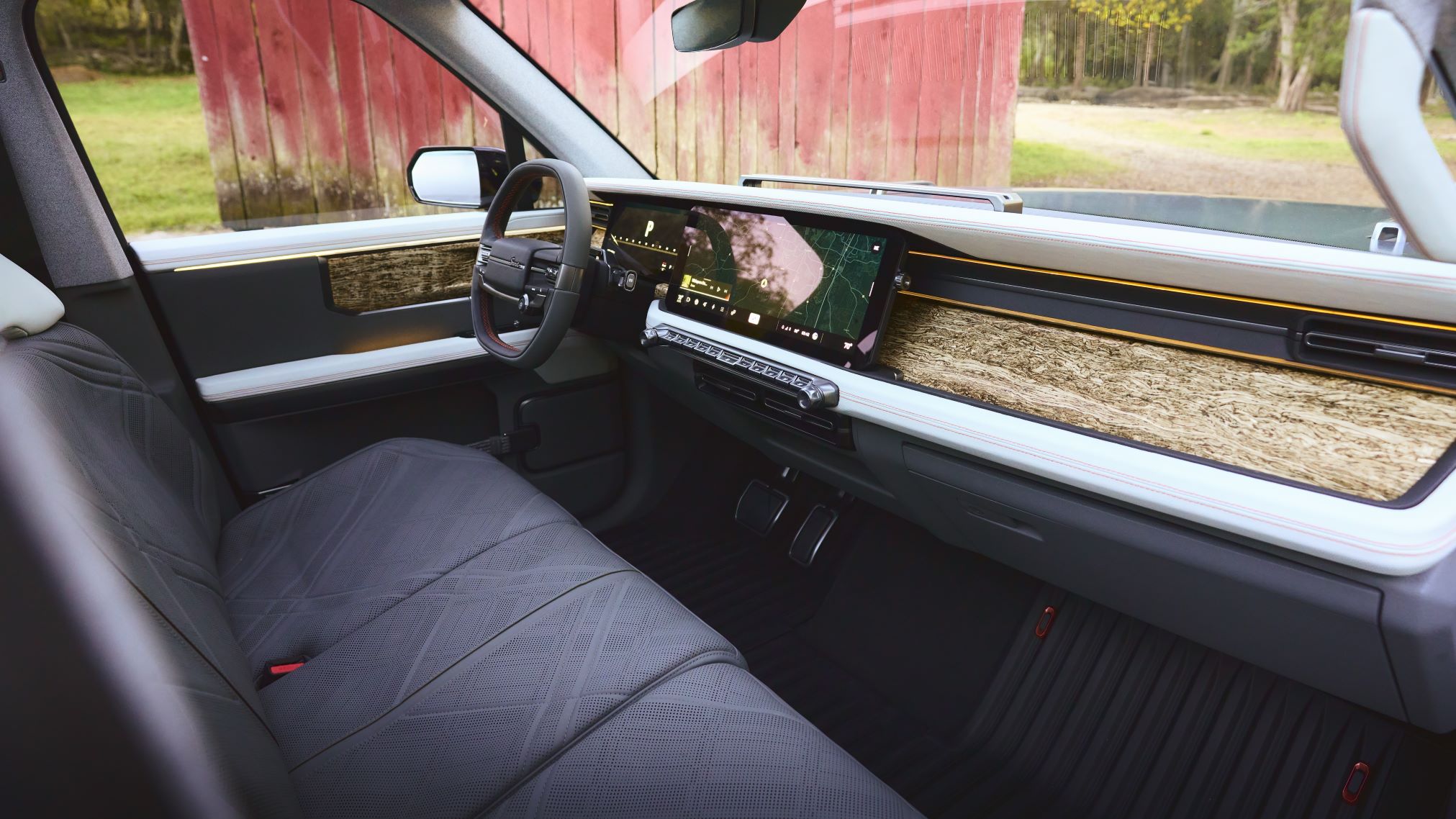 The instrument panel has a bold upper brow and deep undercut reminiscent of the Scout II, with a lower bar that defines and frames the screens in between.