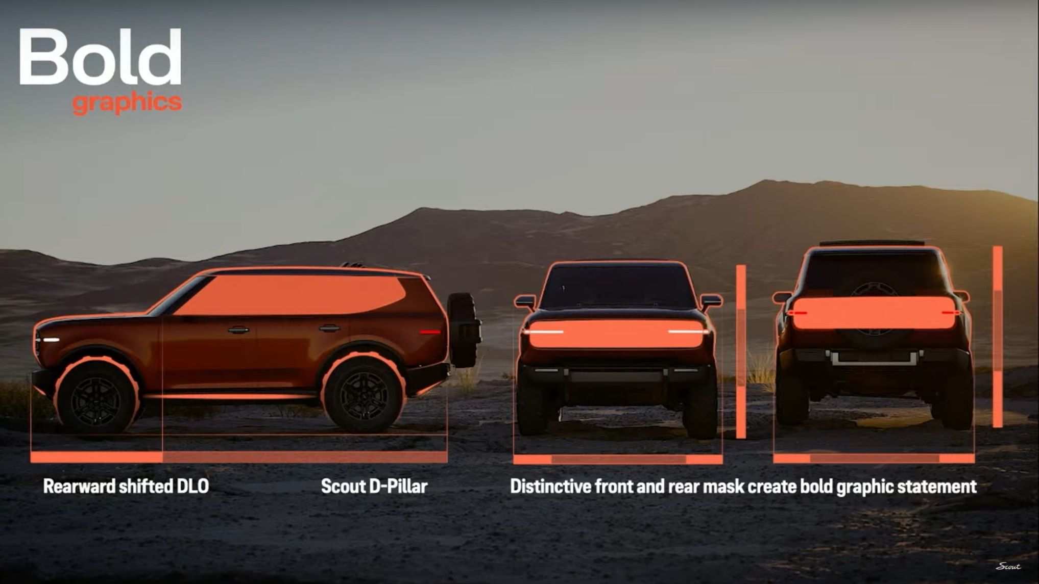 The front and rear black vertical “masks” are another nod to Scout’s heritage. The front and rear daytime running lamp horizontal lines continue from the mask into the body and mimic the side markers on the Scout II SUV, with the Scout logo offset to the right.