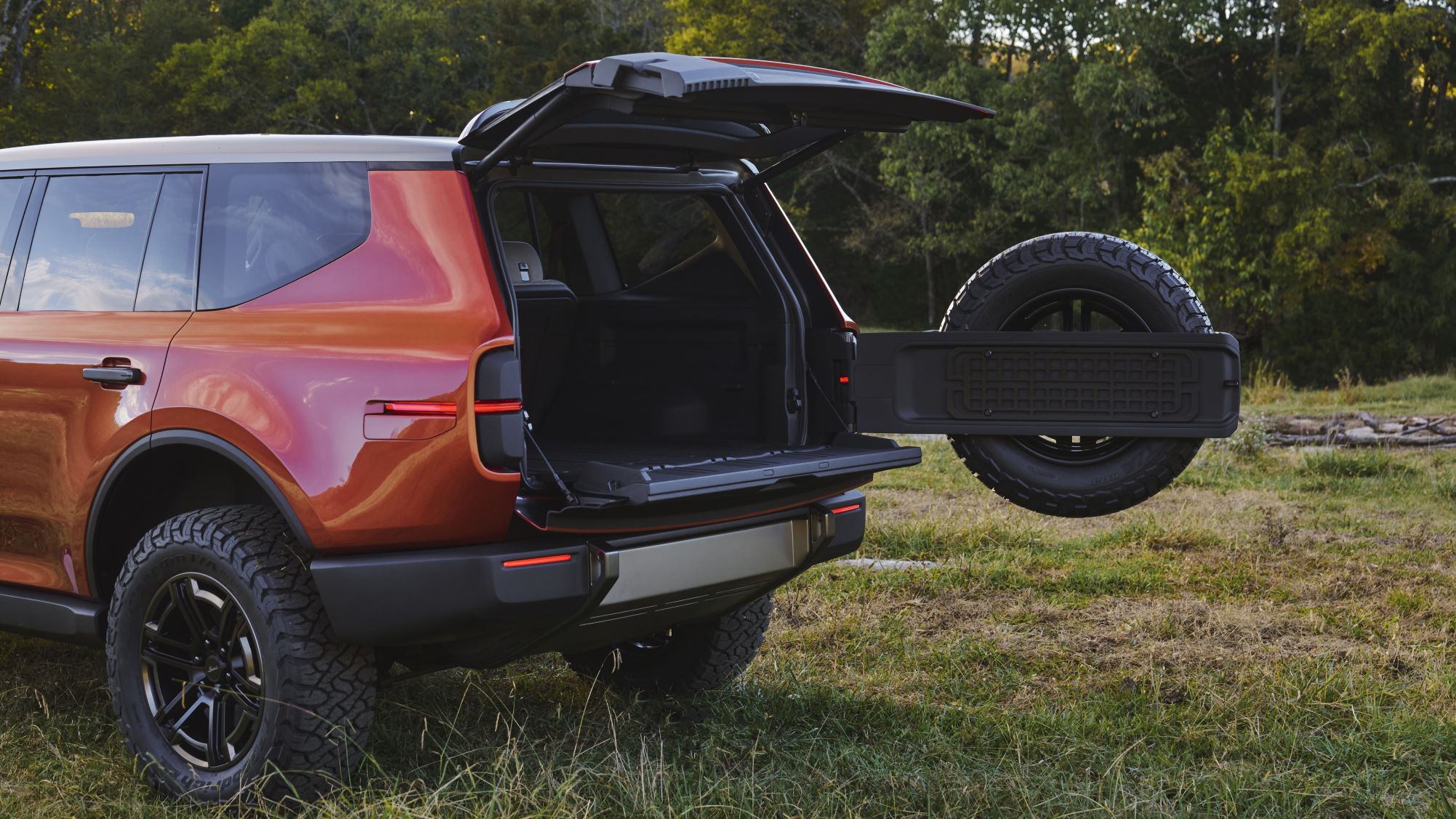 The Traveler’s rear spare tire carrier integrates into the body structure and rear mask graphic, carrying up to a full 35-in spare with minimal impact on aerodynamics. The Terra underbody spare tire carrier can house up to a 33-in tire, with an optional in-bed tire carrier for 35-in all-terrain tires.