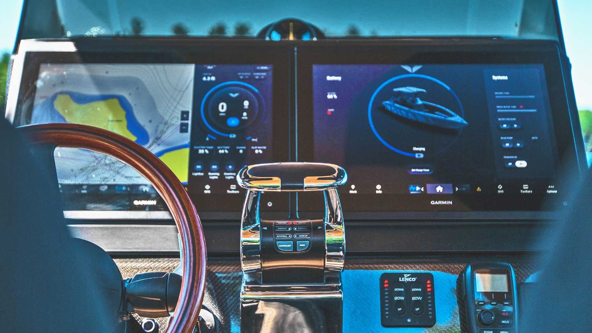 The 26-ft (7.9-m) boat has a 28.1-ft (8.6-m) overall length and weighs 7000 lb (3175 kg). Equipment includes fully integrated control and navigation systems with twin 17-in Garmin touchscreens, Rockford Fosgate sound system, Lumitec digital custom lighting control, and heat-dissipating Alcantara interior.