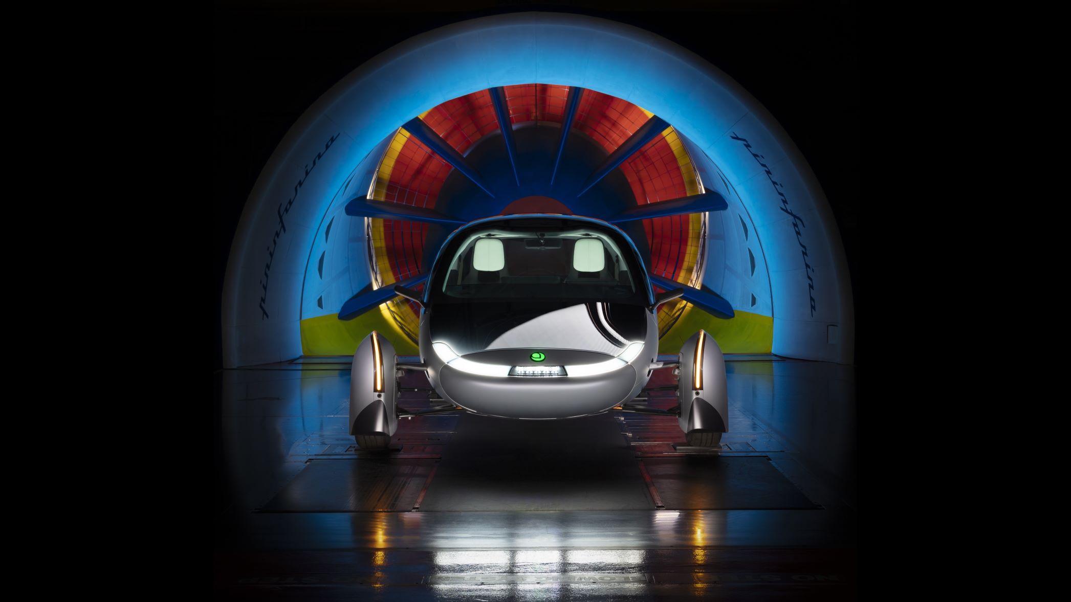 - Aptera SEV front view in Pininfarina wind tunnel.