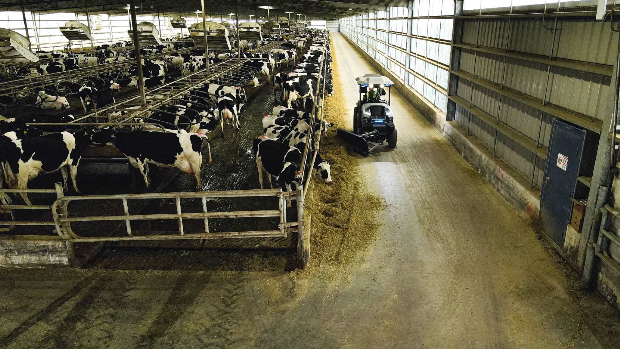 - Monarch Tractor MK-V Dairy with Autodrive pushing feed indoors.
