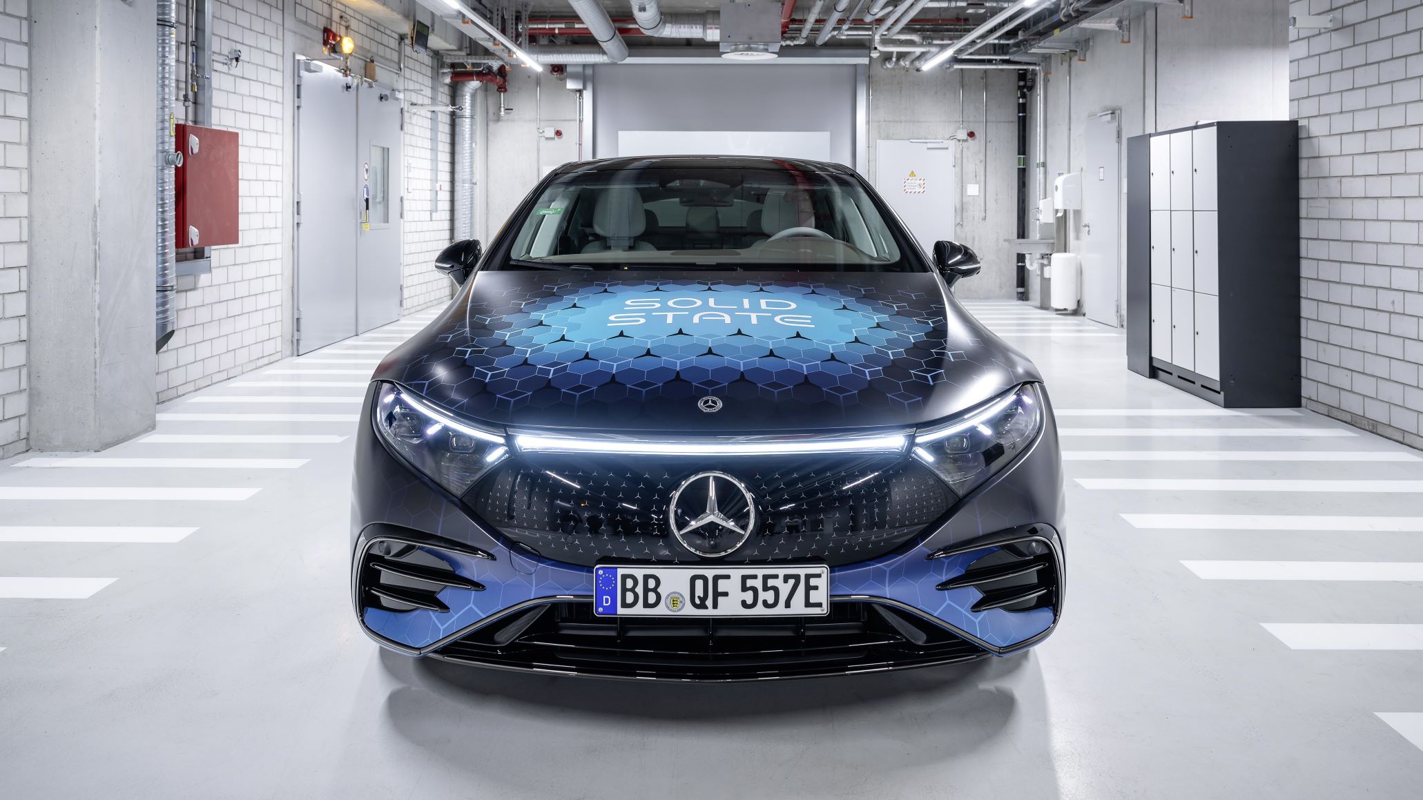 - Mercedes-Benz EQS-based solid-state battery test vehicle front.