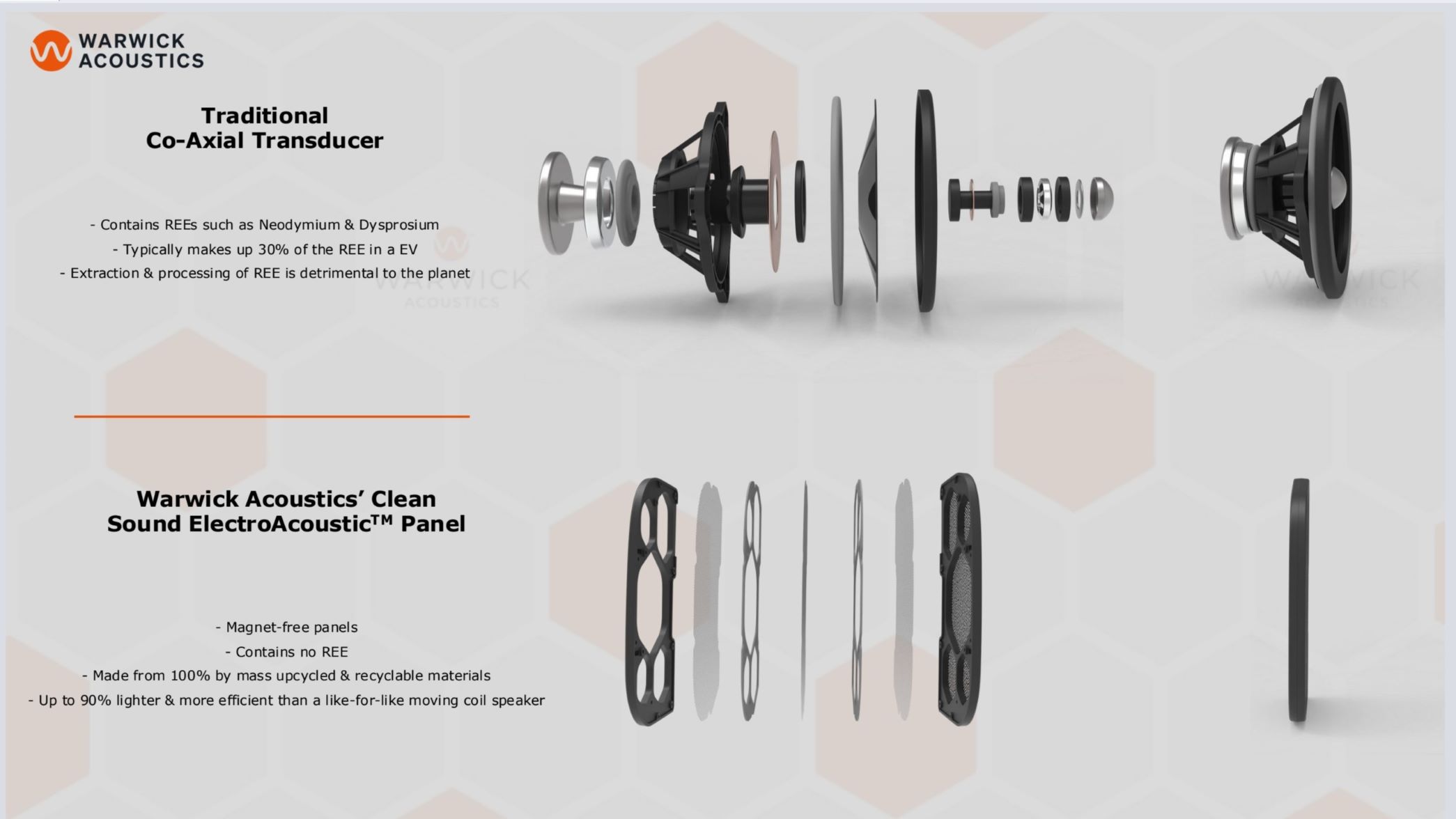 Warwick Acoustics says its panels can deliver speaker solutions for automakers looking to set key sustainability objectives to become carbon neutral. Its solution uses 100% by-mass upcycled and recyclable materials and does not use any unsustainable rare earth elements, which the company says that conventional speakers rely upon in the manufacturing process.