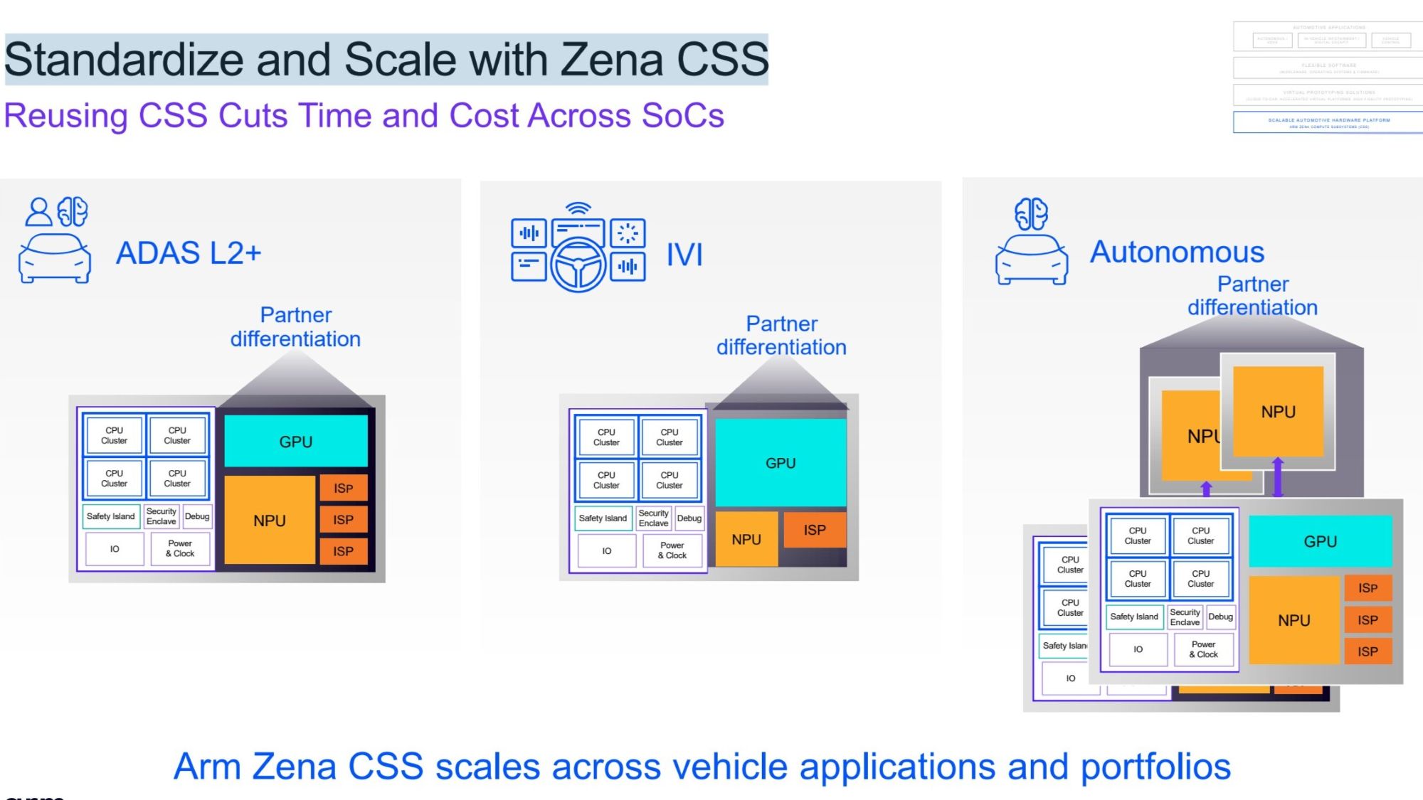 This leads to an overall lower total vehicle platform development cost, with the consistent Arm architecture providing the ability to scale across ADAS, central compute, and IVI use cases for both monolithic and chiplet-based silicon designs.