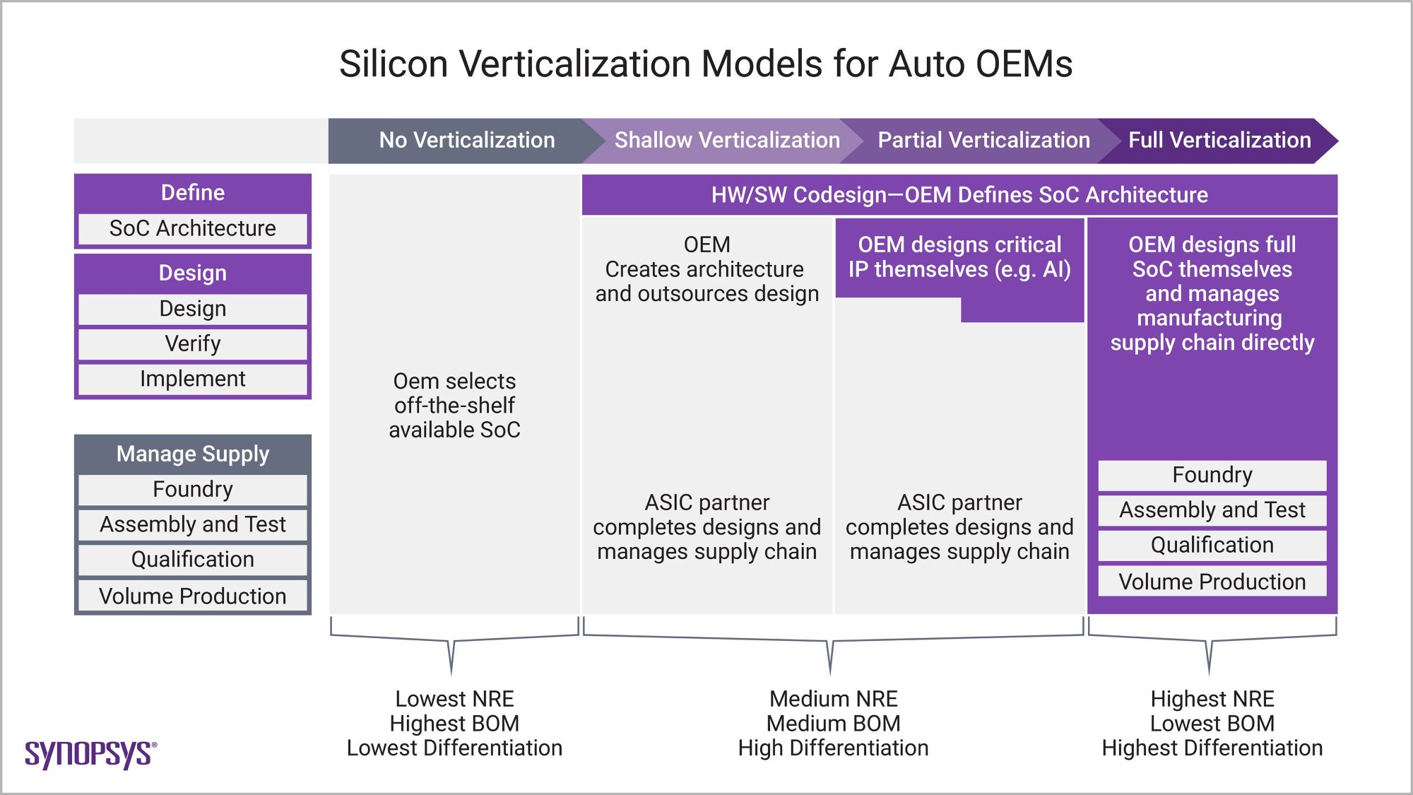 An important question all OEMs must ask is, “How much silicon competence does my organization need?” The answer will determine the degree of verticalization they can achieve across the silicon-to-systems value chain. OEMs that have no verticalization today must decide whether to progress to shallow or partial verticalization or full verticalization. Full verticalization requires the highest NRE (non-recurring engineering) effort but offers the greatest differentiation.