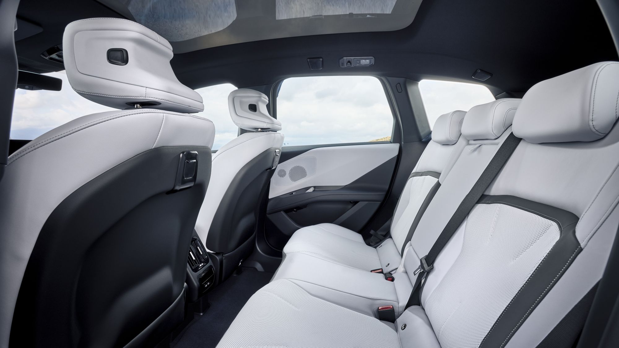 The cabin puts the driver at the heart of a minimalist layout. Large windows and a full-length panoramic sunroof flood the interior with natural light.