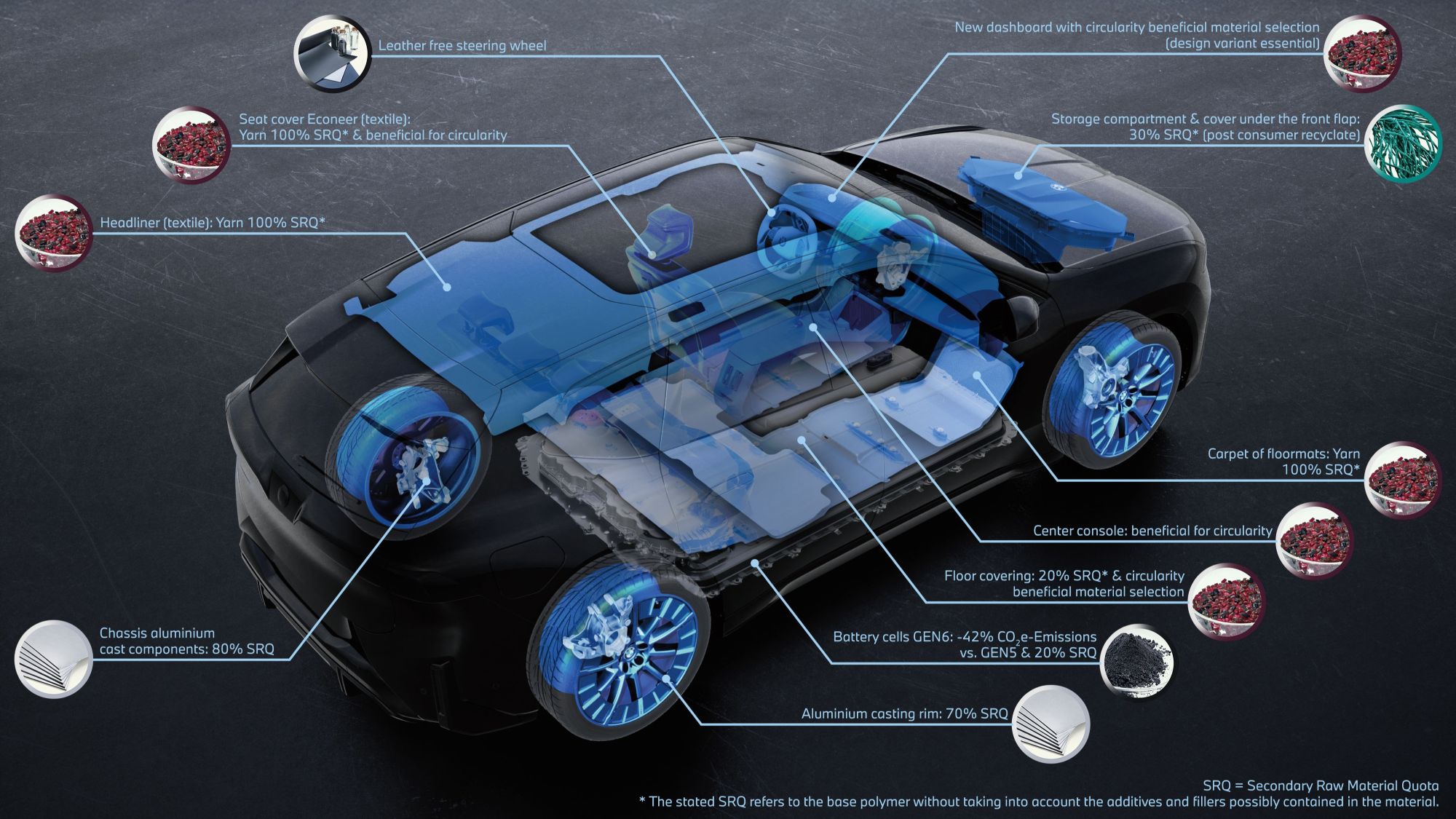 About a third of the iX3 is made from secondary raw materials. Examples include the thermoplastic components for the motor compartment; the storage space under the hood and its cover, made from 30% recycled marine plastic; Econeer seat upholstery produced using 100% recycled PET textiles; and yarn containing 100% recycled materials used for the headlining and floor mats.
