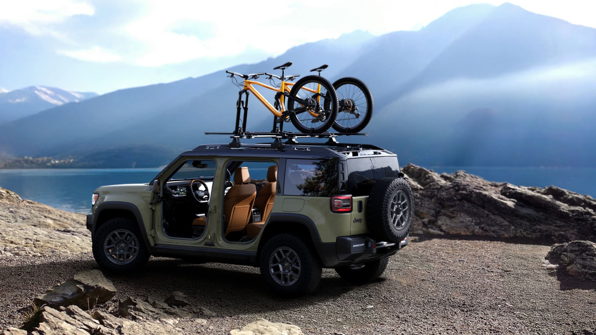 Jeep says that the Recon is the only fully electric vehicle with removable doors, rear quarter glass, and swing gate glass—with no tools required. It offers a standard dual-pane sunroof or an available, class-exclusive Sky One-Touch power top.