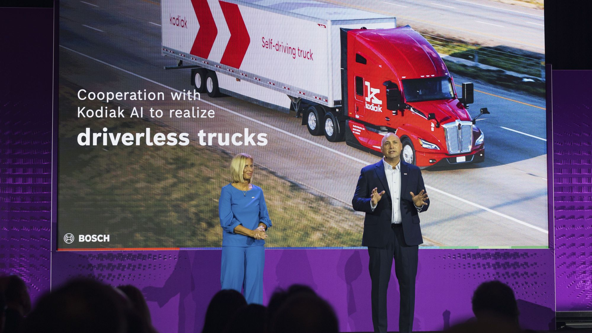 Tanja Rückert, Member of the Bosch Board of Management, and Paul Thomas, President, Bosch in North America and President, Bosch Mobility Americas, announced the deal at the CES press conference 2026. A Kodiak Driver-powered autonomous truck is being displayed in the Bosch booth during the show.