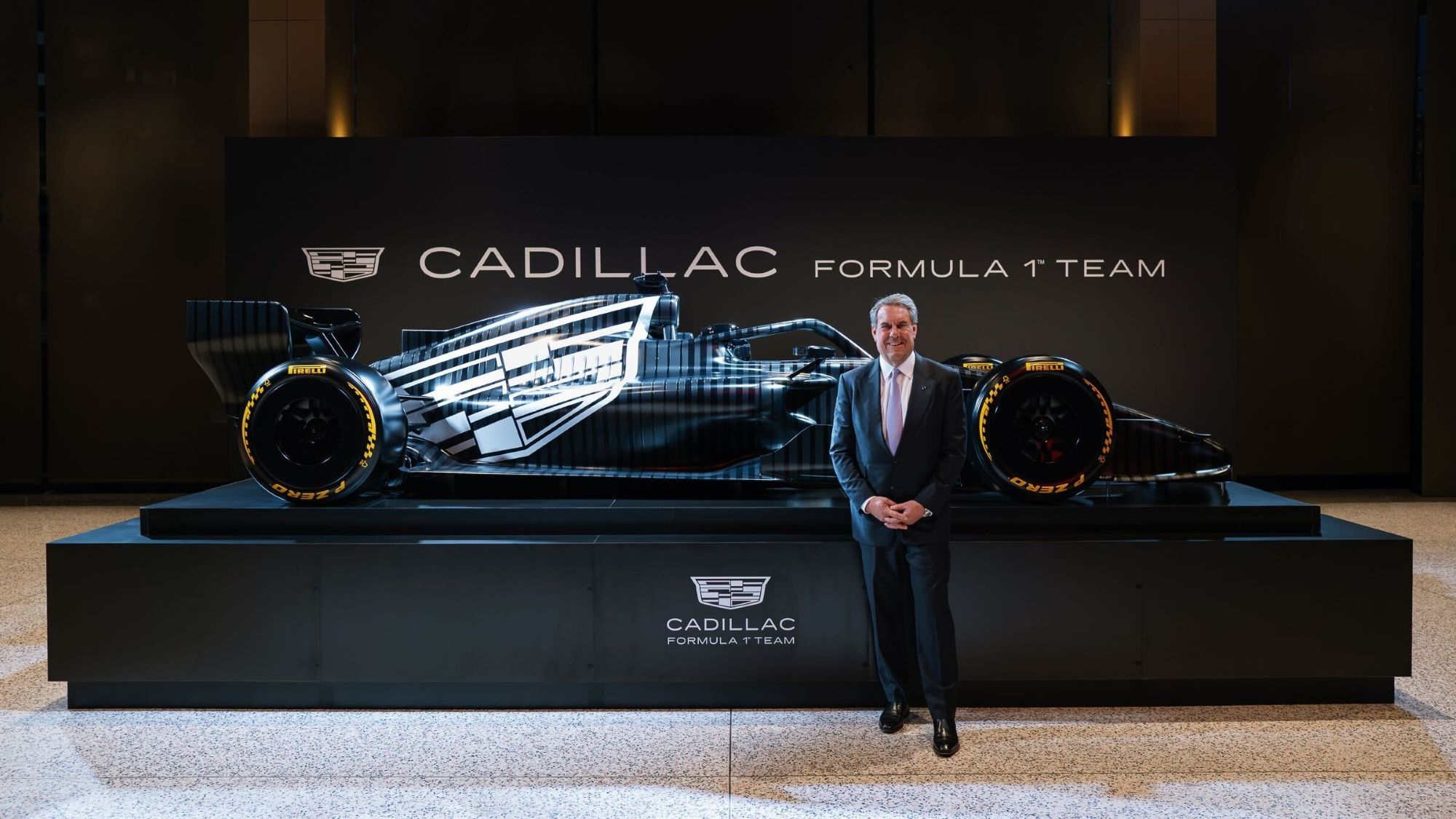 - GM’s Mark Reuss with Cadillac Formula 1 test livery.