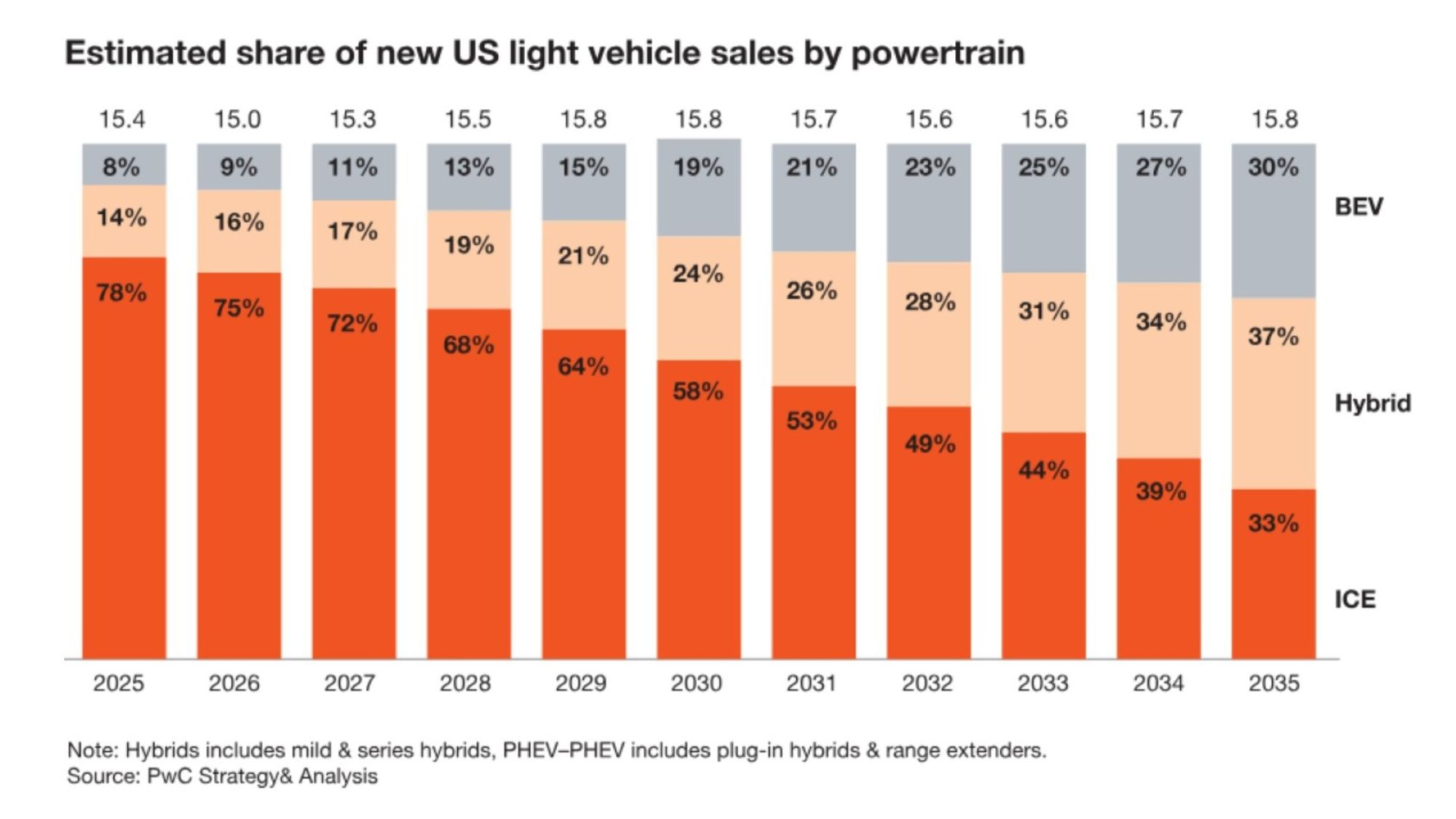 According to leading consulting firm PwC, BEVs (battery electric vehicles) are expected to reach broad cost competitiveness with ICE (internal combustion engine) vehicles in the U.S. around 2028-2029, driving adoption to roughly 20% by 2030 and about 30% by 2035. That’s based on the firm’s new 2026 Automotive Industry Outlook, with intelligence from PwC Auto leaders like C.J. Finn or Akshay Singh, which dropped today. The report, previewed by Futurride, shares a “clear-eyed view” of where the auto industry is heading amid shifting consumer preferences, supply chain realignment, and an evolving EV (electric vehicle) and hybrid landscape.