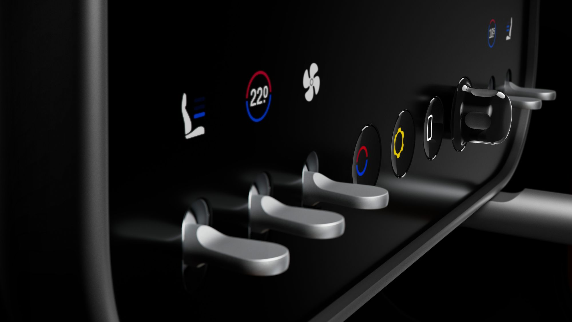 The instrument cluster controls are inspired by both historic automotive cues and the “purposeful” graphics of aviation. Its displays are designed to resemble analog gauges, delivering a sense of familiarity and tactile engagement, yet are fully digital beneath their surfaces.