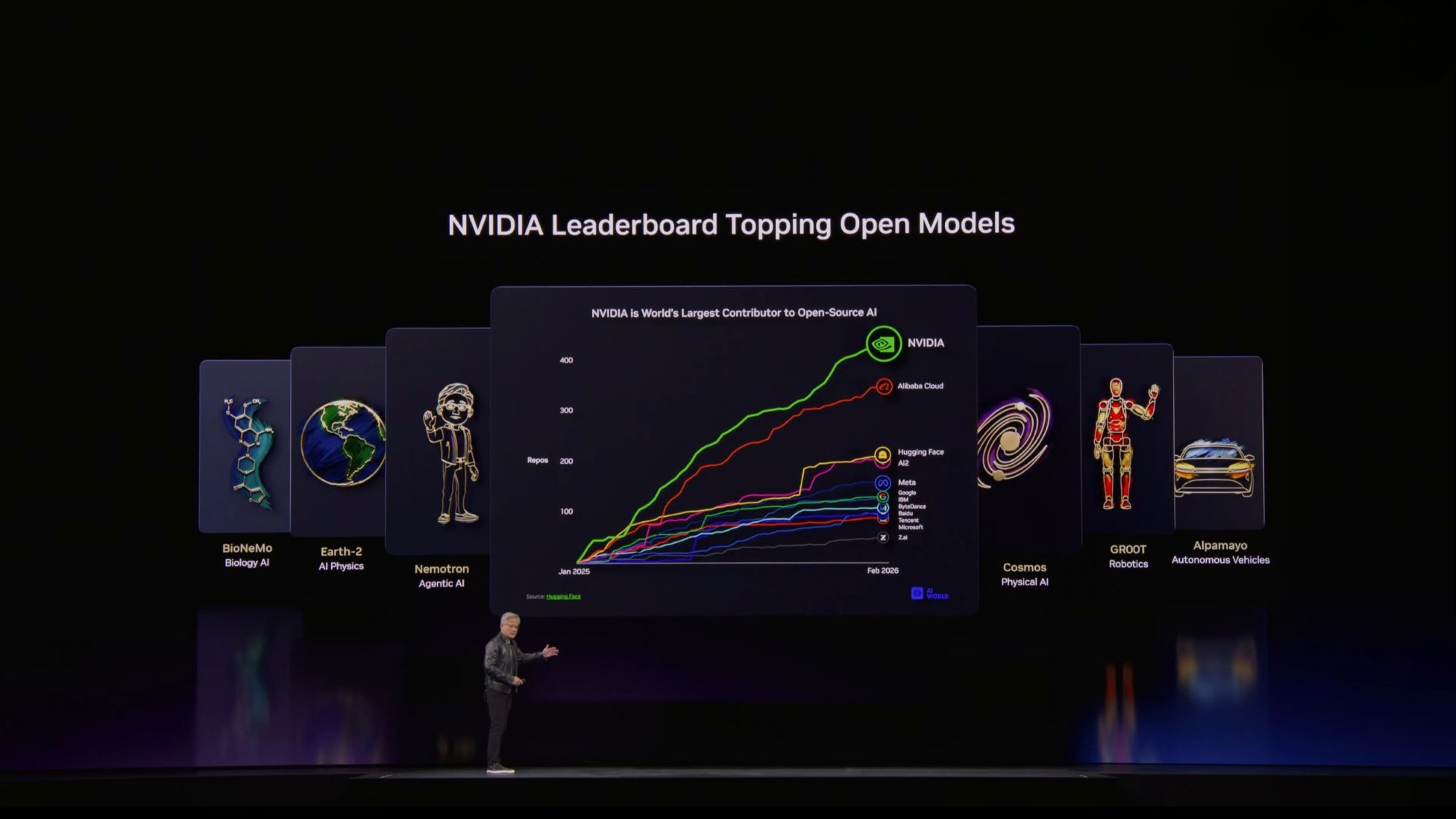 Huang says that Nvidia’s open-model initiative across language, vision, biology, physics, and autonomous systems will enable AI builds for specialized domains and their “custom claws” or models. The company has built and released six families of open frontier models, as well as the training data, recipes, and frameworks to help developers customize and adopt.