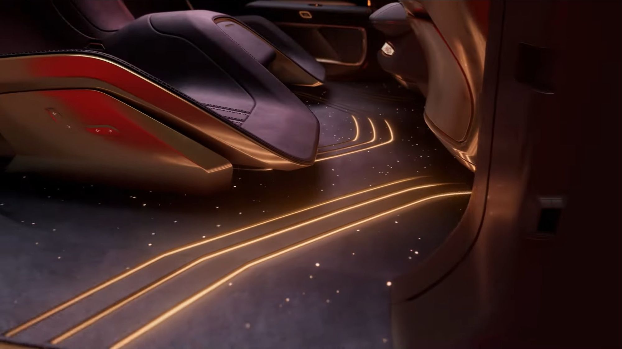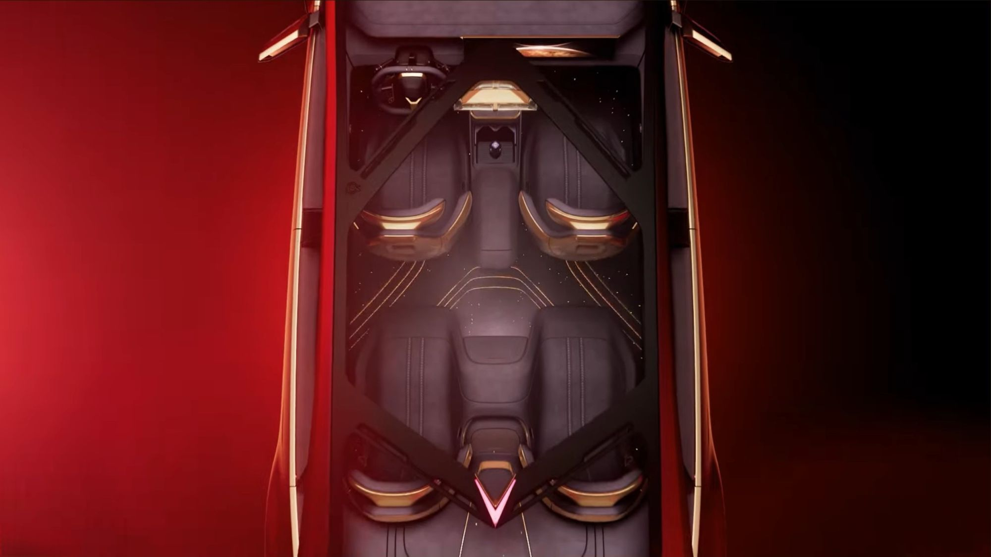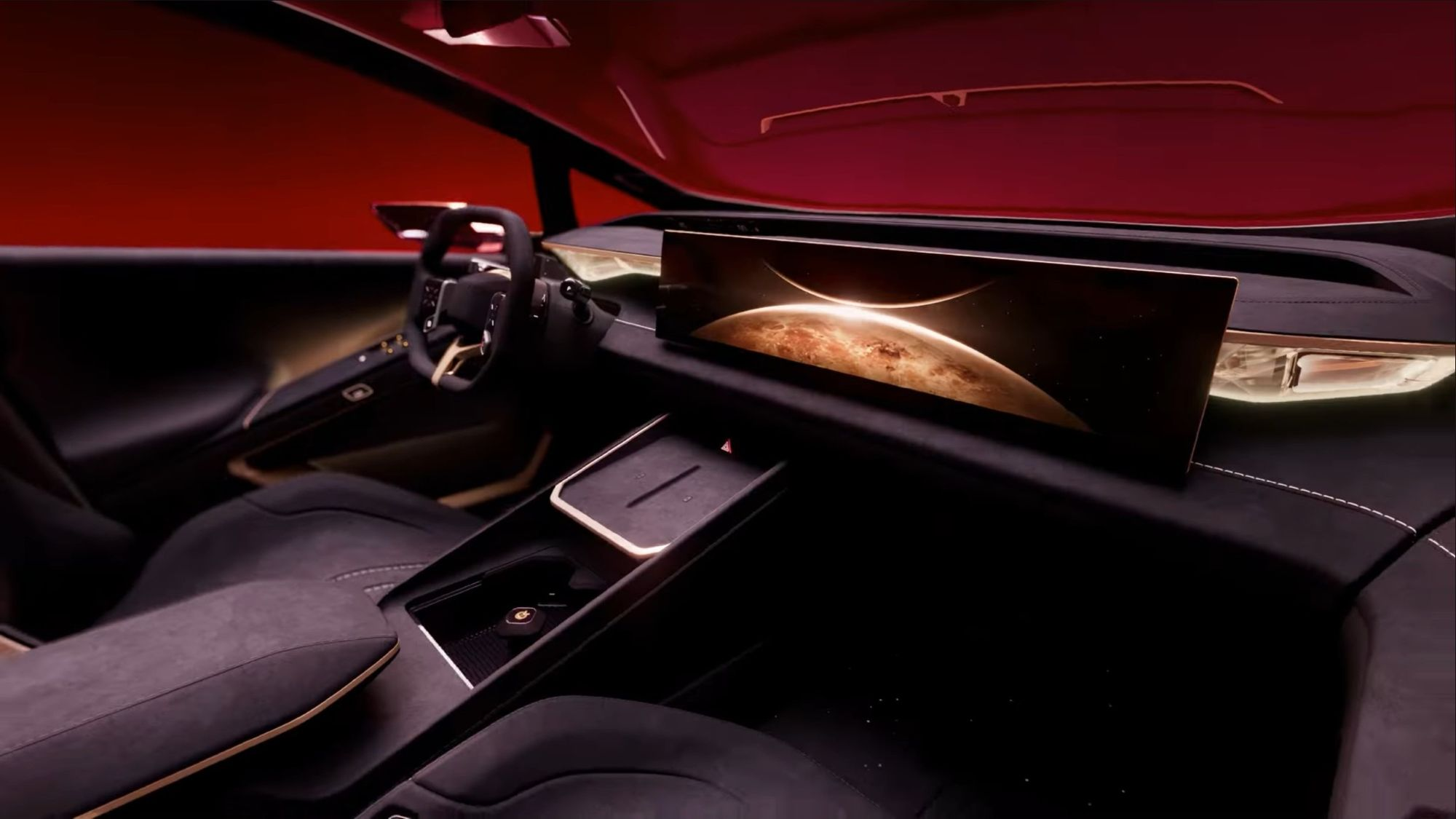 The driver-focused, wrap-around cockpit evokes Venus’s “glowing atmosphere” with layered mood lighting. A strong material contrast between soft suede and solid, chrome-gold seatback covers is meant to enhance the premium feel. A friendly Lumi character is integrated into the design for a connection between driver and vehicle.